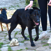Zoe ist eine wunderschöne schwarze Hündin mit lustigen Ohren, die ihr einen ganz besonderen Ausdruck verleihen. Sie wurde völlig verwahrlost und voller Zecken auf einem Feld gefunden und kam so ins Tierheim Copertino. Trotz dieser traurigen Erfahrung ist Zoe eine offene, freundliche und menschenbezogene Hündin geblieben.